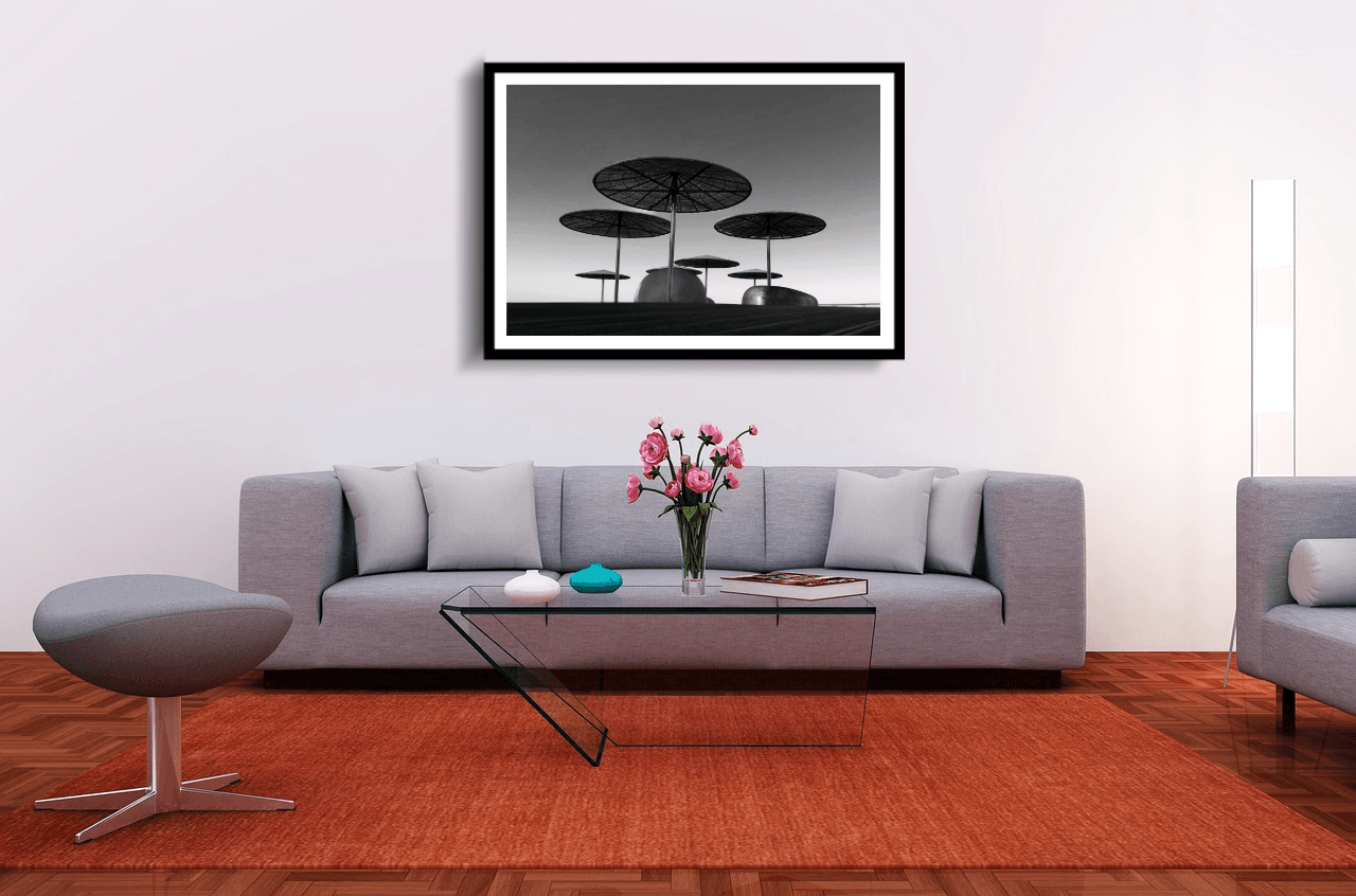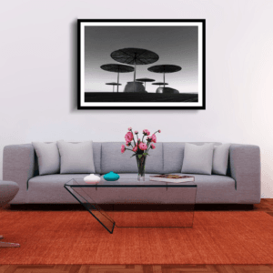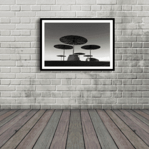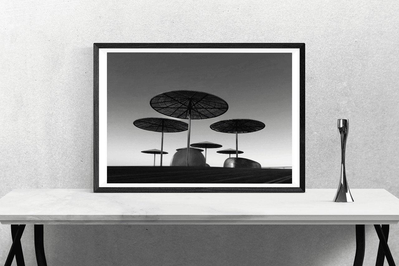 Black and white photo of umbrellas on a pierUmbrellas